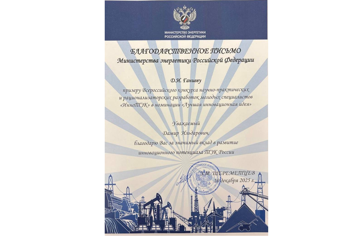 Дамир Ганиев занял почетное 2️ место в номинации «Лучшая инновационная идея в нефтегазовом комплексе» с разработкой «Применение соленой воды из системы ППД для проведения ГРП». Награждение его дипломом призера прошло в Министерстве энергетики Российской Федерации в г. Москве. Награду наш молодой рационализатор получил из рук заместителя министра энергетики РФ Эдуарда Шереметцева.